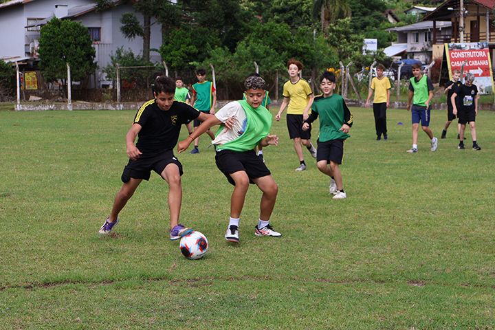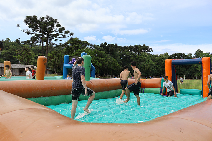 Durante a festa de encerramento, as crianças foram organizadas em quatro grupos, que participaram de um revezamento entre quatro estações de brincadeiras: vôlei, futebol, futsal e brinquedos infláveis.