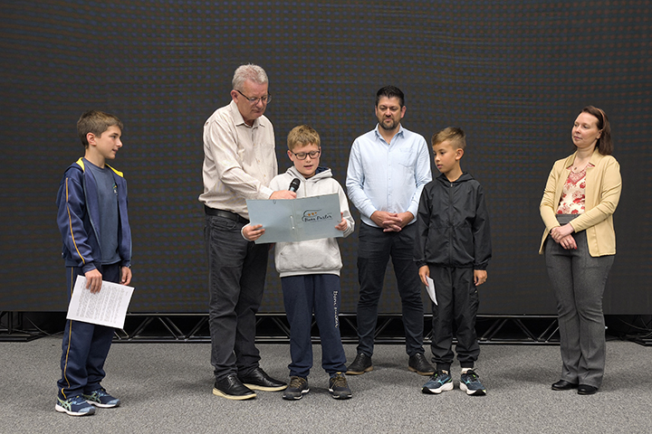 As Autoridades Mirins empossadas em 2024 também conversaram com os estudantes. O prefeito mirim, Cauã Henrique Thiele Arend; o vice-prefeito mirim, Leonardo Weber Lira; e o presidente mirim da Câmara de Vereadores, Nicolas Pottratz Schaefer, contaram como foi participar do projeto “Prefeito por Um Dia”, promovido pela Prefeitura Municipal, que tem como objetivo aproximar as crianças da rotina administrativa do Município, estimulando a participação cidadã desde cedo.