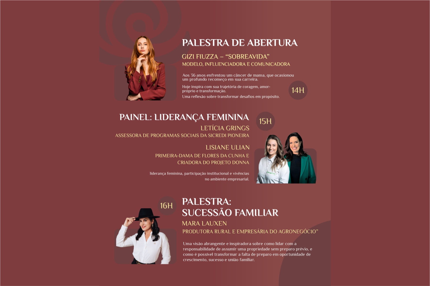 Entre os destaques está a palestra "SobreAvida", com GiziFiuzza, modelo, influenciadora e comunicadora que transformou sua própria história em um poderoso convite à reflexão. Após enfrentar um câncer de mama aos 36 anos, Gizi passou a compartilhar sua jornada de recomeço e ressignificação. Na palestra, ela fala sobre escolhas, coragem, amor-próprio e a força que existe em cada mulher para seguir em frente, mesmo diante dos maiores desafios.