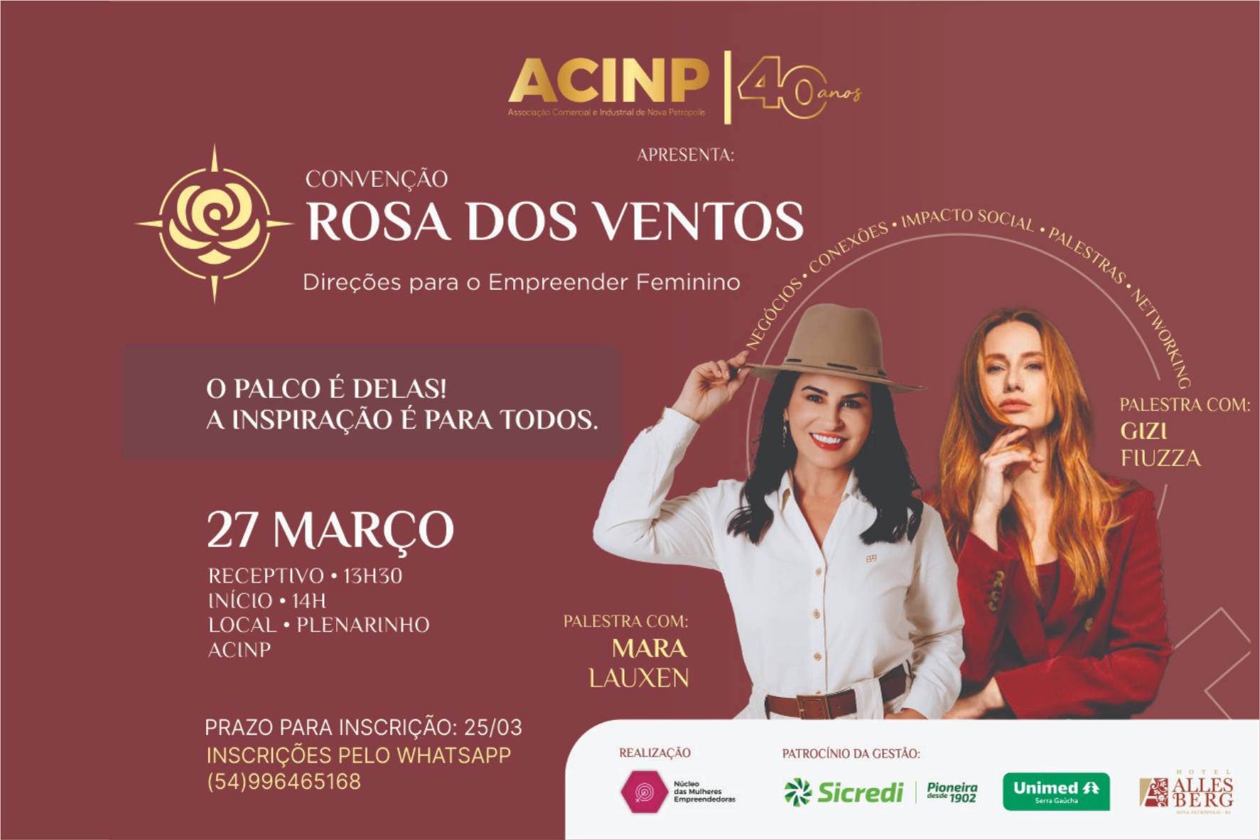 Histórias de coragem, superação, liderança e transformação estarão no centro da Convenção Rosa dos Ventos - Direções para o Empreender Feminino, evento inédito promovido pelo Núcleo de Mulheres Empreendedoras da ACINP, que acontece no dia 27 de março, no Plenarinho da entidade, em Nova Petrópolis. A programação foi pensada para inspirar, provocar reflexões e fortalecer conexões entre mulheres que empreendem ou desejam empreender.