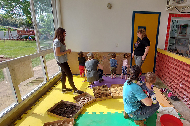 O projeto também contemplou oficinas de educação ambiental, ministradas pelas professoras Kelly Fabiane Spier e Cristiane Sofia Kaiser, oferecidas do Berçário I à Pré-Escola B. As atividades permitiram que as crianças vivenciassem momentos de contato direto com elementos naturais, como cores, texturas, cheiros e sons, fortalecendo o vínculo entre aprendizagem e ambiente.