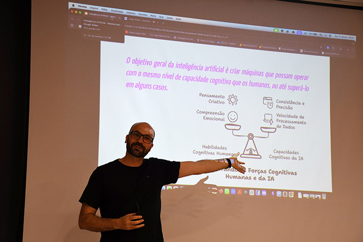 O professor e especialista em IA, Guilherme Bertoni Machado, conduziu a apresentação destacando que as inteligências artificiais, hoje amplamente disponíveis, devem ser vistas como ferramentas de apoio ao trabalho humano. Segundo ele, mesmo com o avanço dessas tecnologias, é essencial que o ser humano permaneça como protagonista nas decisões.