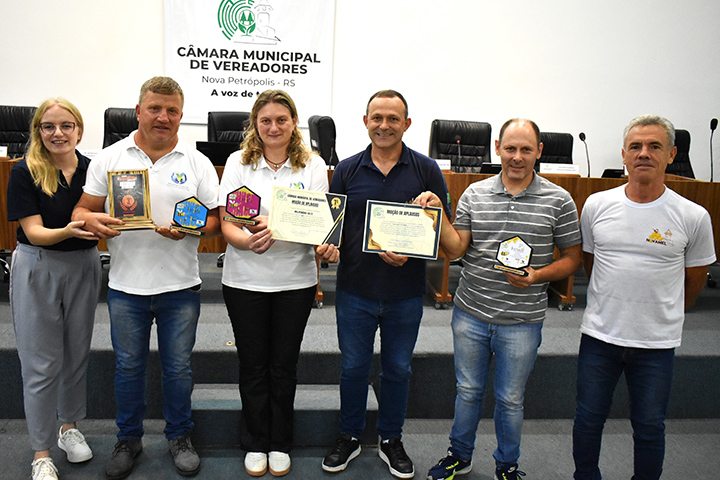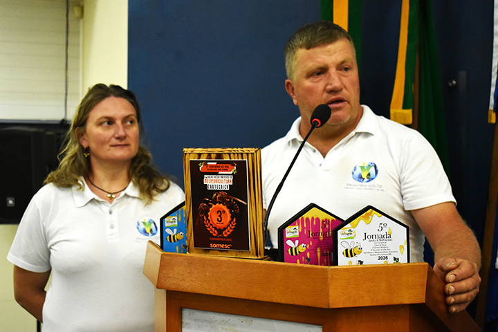 A Sessão Ordinária da Câmara de Vereadores recebeu nesta semana representantes da Associação Nova Mel e os sócios proprietários do Meliponário Voltz, Leandro Voltz e Marcia Birck. O vereador Tarcísio Brescovit, que preside a Casa Legislativa propôs a entrega de uma Moção de Aplausos que foi aprovada por unanimidade, tendo em vista o trabalho desenvolvido e o primeiro lugar alcançado pelo Meliponário Voltz no concurso de mel das melíponas realizado em São José dos Ausentes – durante o 4º Concurso de Mel Sul Brasileiro de Meliponas que reuniu produtores e especialistas de diversas regiões, com o objetivo de valorizar a qualidade e incentivar o desenvolvimento da meliponicultura.
