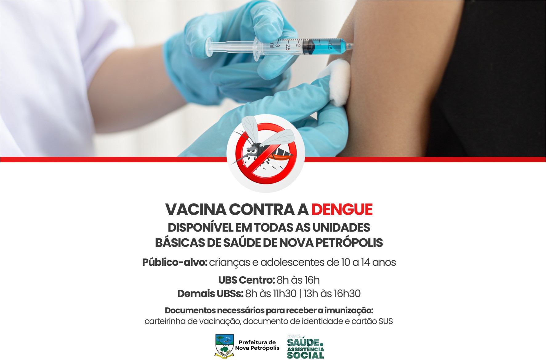 A Secretaria de Saúde e Assistência Social de Nova Petrópolis informa que a vacina contra a Dengue já está disponível em todas as Unidades Básicas de Saúde (UBSs) do Município. A imunização é destinada, exclusivamente, a crianças e adolescentes de 10 a 14 anos (14 anos, 11 meses e 29 dias). São duas doses, com intervalo de 90 dias entre elas. A vacinação ocorre de segunda a sexta-feira, das 8h às 16h na UBS do Centro, e das 8h às 11h30 e 13h às 16h30 nas demais UBSs. Para receber a vacina, os pais ou responsáveis devem apresentar carteirinha de vacinação, documento de identidade e cartão SUS da criança ou adolescente.