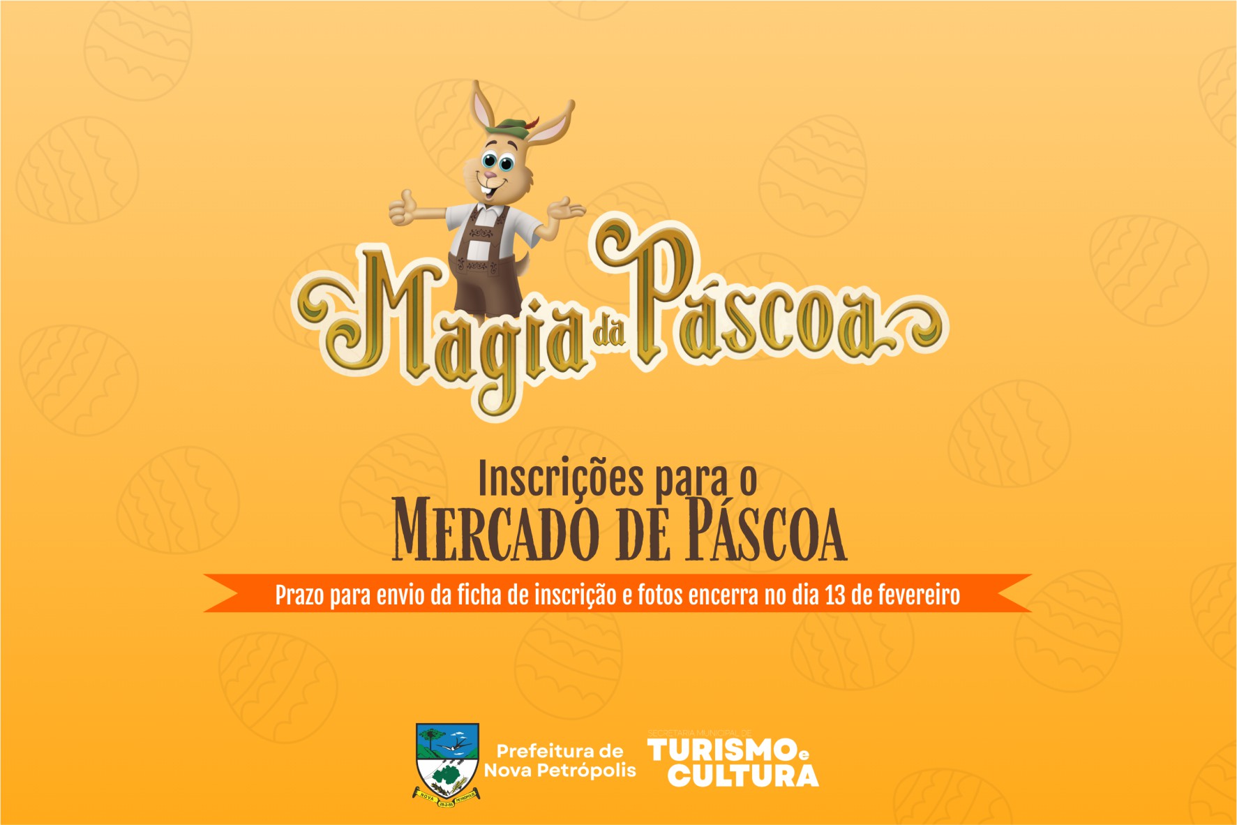 A Prefeitura de Nova Petrópolis, por meio da Secretaria de Turismo e Cultura, abre inscrições para expositores interessados em realizar a comercialização de artesanatos e guloseimas (doces, chocolates e afins) no Mercado de Páscoa, durante a Magia da Páscoa 2026.